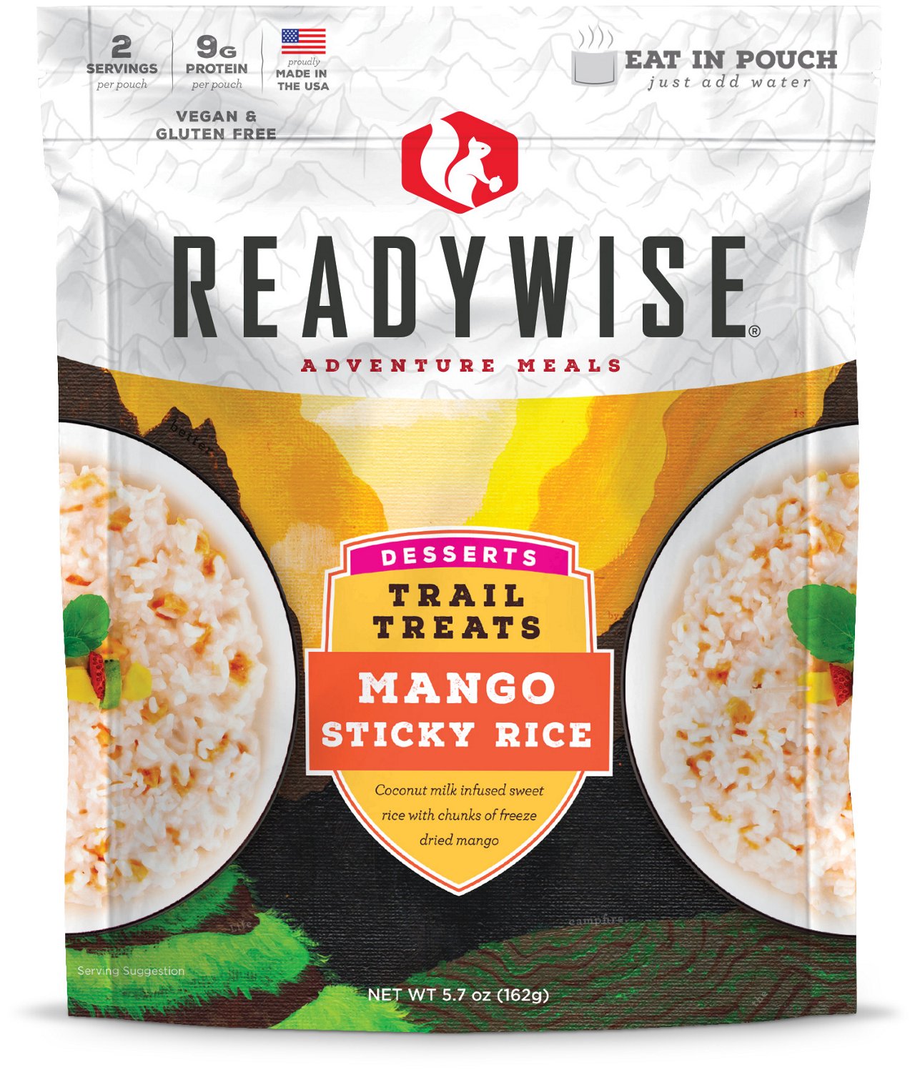 Head to the campgrounds with the ReadyWise Trail Treats Mango Sticky Rice. This delicious mango sticky rice comes in a lightweight and portable pouch that is great for any outdoor adventure. Just add water and you can eat directly from the pouch.