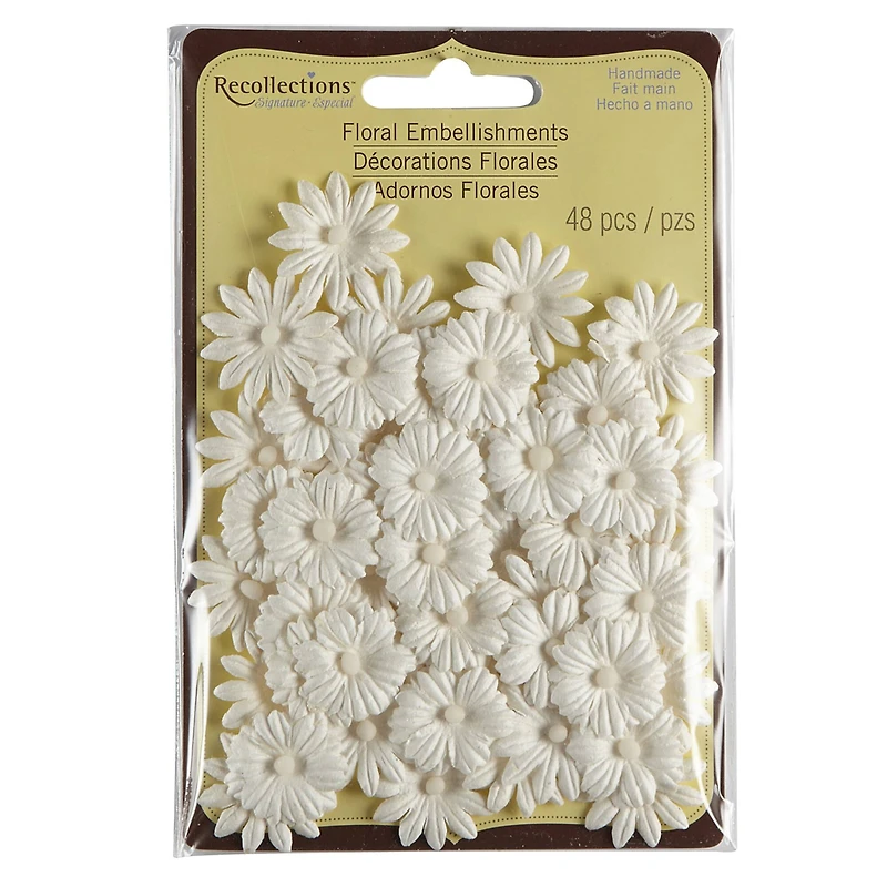 This package of floral embellishments will enrich your scrapbook pages and card creations. These paper daisy flowers with cute button-like centers are perfect for your paper projects. You can even ink them to enhance the look! Details:Available in multiple colorsIncludes 48 piecesPaper