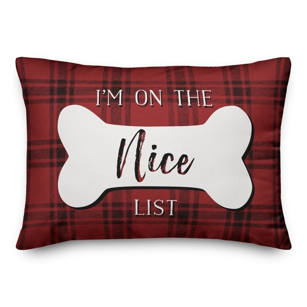 Add a festive flair to your holiday decor with this Red and Black Plaid Naughty and Nice Bone Pillow. The bone accent is perfect for any dog lover! Pillow measures 20L x 1.5W x 14H in. Crafted of polyester Plaid design Bone feature Front reads "I'm on the nice list" Back reads "I'm on the naughty list" Hues of red, black, and white Care: Spot clean only. This item is available at Kirklands.com only, not available in stores. Please note: this item cannot be shipped to APO/FPO addresses.