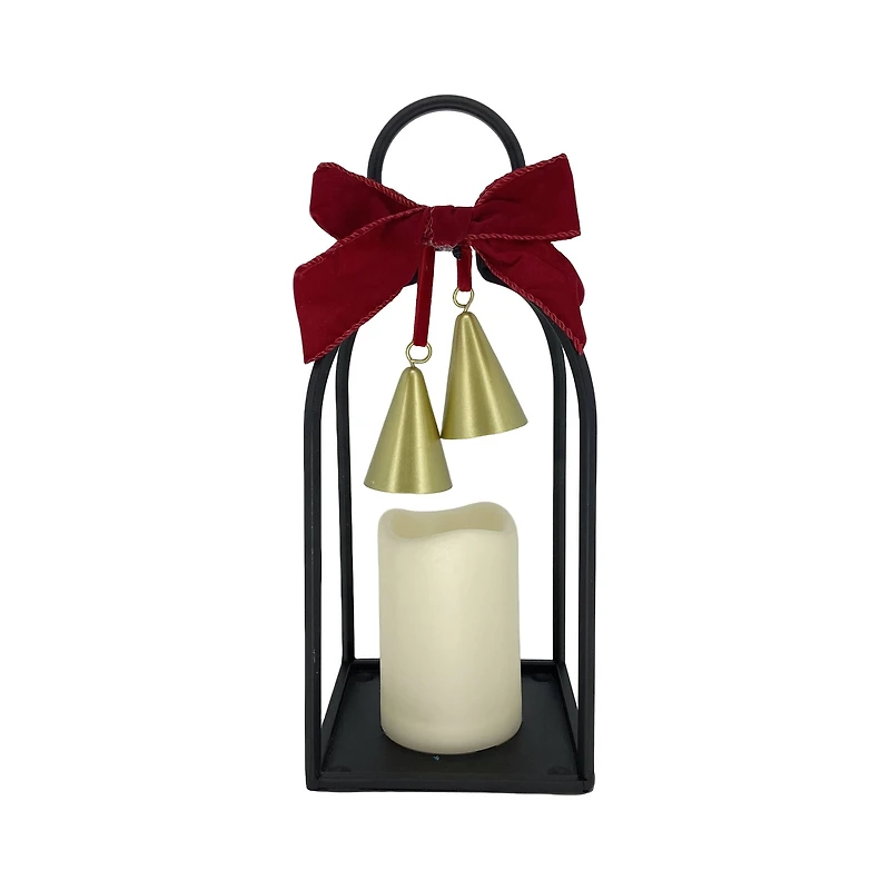 Create an inviting space this Christmas as you light up the room with this stylish flameless lantern. The black metal frame holds a battery-operated LED candle and is topped with a red bow and gold bells, the perfect addition to your holiday home or office.Details:Black lantern with pillar candle styleAvailable in multiple sizes1 warm white LED lightRequires 3 AAA batteries (not included)Timer: 6 hours on, 18 hours offIron, plastic and polyesterFor indoor use onlySize Information:Small: 5.25" x 5.25" x 12.5" (13.34cm x 13.34cm x 31.75cm)Large: 6.25" x 6.25" x 14" (15.88cm x 15.88cm x 35.56cm)