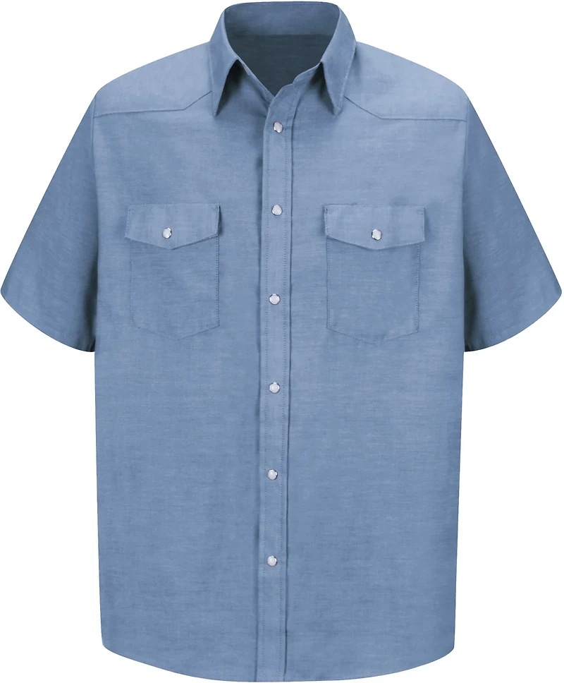 Bring your Western roots to work with this Red Kap Men's Deluxe Western Work Shirt. Its pearlized snaps and unique back yoke add some style to your usual ensemble. The shirt has short sleeves to keep you cool and durable chambray fabric that'll hold up through every wash. 2 chest pockets, 1 pencil stall.