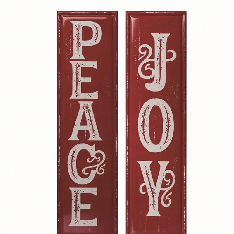 Create a calm, comforting feeling in your home with the set of Red Metal Peace and Joy Wall Plaques. Detailed with scroll accents and a distressed finish, these wall signs radiate rustic charm. Set includes two (2) plaques Overall dimensions Width: 11.75 in. Depth: 0.75 in. Height: 47.25 in. Crafted of metal Distressed finish Features the text "Peace" and "Joy" Hues of red and white Weight: 5.5 lbs. Hangs from back-mounted hardware Care: Dust with a soft, dry cloth. This item is available at Kirklands.com only, not available in stores. Please note: this item cannot be shipped to APO/FPO addresses.
