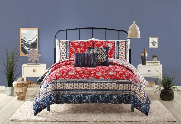 Transform your bed into an oasis of rest and relaxation with our Red Navy Marbella Queen 5-pc. Comforter Set. This soft and luxurious set creates an inviting atmosphere that you'll love climbing into after a long day! Set includes one (1) comforter, two (2) pillow shams, one (1) lumbar throw pillow, and one (1) square throw pillow Comforter measures 90W x 90L in. Pillow sham measures 26L x 20W in. Throw pillow measures 16W x 16L in. Lumbar pillow measures 16L x 12H in. Crafted of 100% cotton with poly fill Paisley design on one side and Jacobean design on the other Hues of red, navy, cream, and black Care: Machine Wash. Cold Water. Gentle Cycle. Do Not Bleach. Tumble Dry Low Heat. Use Large Capacity Machine This item is available at Kirklands.com only, not available in stores. Please note: this item cannot be shipped to APO/FPO addresses.