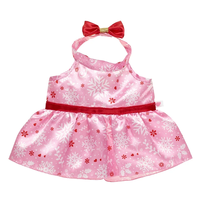 Make a flurry of a fashion statement and dress your four-legged plush in this pretty red and pink snowflake dress for stuffed animals.