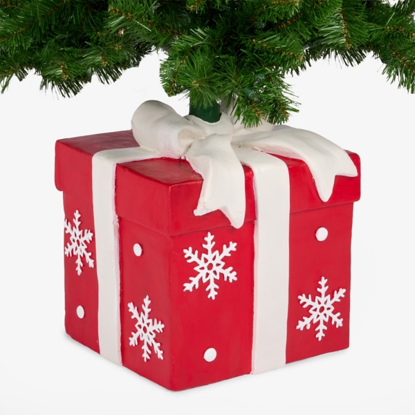 Our Red Present with Bow Christmas Tree Base will perfectly wrap up your tree! This tree stand can support a Christmas tree up to 5 feet in height. If you embrace a whimsical Christmas tree style, this Christmas tree stand adds a charming finishing touch. Base measures 11.75L x 11.75W x 13H in. Crafted of resin Present with bow design Snowflake and dot accents Hues of red and white Supports artificial Christmas trees 4-5 ft feet in height Care: Dust with a soft, dry cloth. Contact your local Kirkland’s store for availability. Quantities and selection may vary by location.