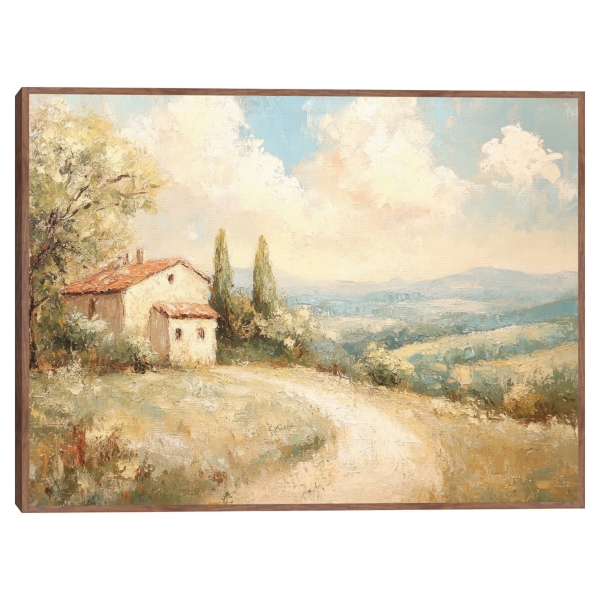 Take in the quiet beauty of nature with this Red Roof Villa Framed Canvas Art Print. With rolling hills and a terracotta cottage, it adds a stunning view to any wall! Overall dimensions Width: 41 in. Depth: 1.5 in. Height: 31 in. Printed on stretched, polycotton blend canvas Brown frame around wrapped canvas Features a landscape with a villa Hues of green, white, blue, tan, and red Weight: 9 lbs. Hangs from back-mounted hardware; sawtooth hangers included Care: Dust with a soft, dry cloth. This item is available at Kirklands.com only, not available in stores. Please note: this item cannot be shipped to APO/FPO addresses. WARNING: Cancer and Reproductive Harm - For more information go to www.P65Warnings.ca.gov .