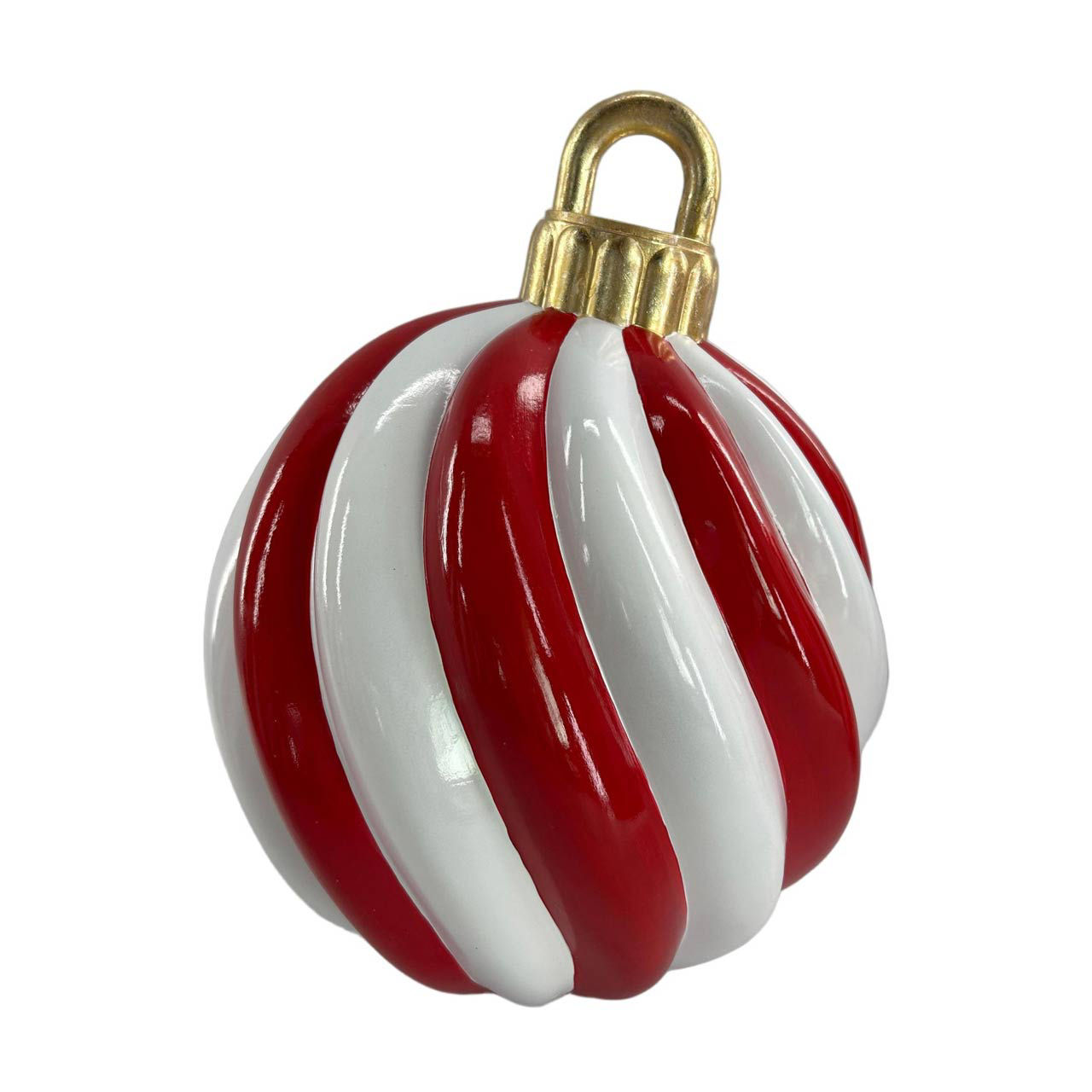 Featuring a classic swirl pattern in vibrant red and crisp white, this ornament exudes the timeless charm of the season. The glossy finish enhances its visual appeal, making it a standout piece that captures the light beautifully. The ornament is topped with a gold-toned cap and loop, adding a touch of sophistication and making it easy to hang and display.
