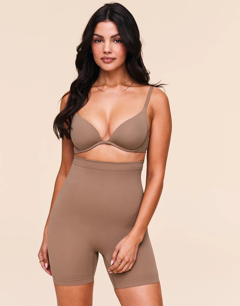 This seamless shapewear short is high-waisted and made of seamless knit with zoning for tummy and thigh smoothing. The inner silicone waistband prevents rolling, so you can move around without having to worry about your shapewear going anywhere. (Available in sizes XXS/XS-3X/4X)