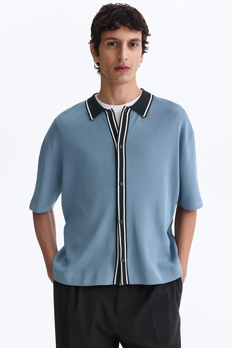 Regular-fit shirt in a soft rib-knit with a comfortable, classic silhouette. Turn-down collar, concealed buttons at front, dropped shoulders, and short sleeves. Straight-cut hem.