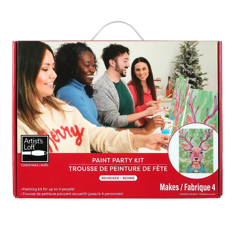 Have creative fun as you host a festive painting party with friends and family using this cool kit. This activity kit comes with everything needed for four people, including canvases, paints, brushes and more. Once complete, everyone in your group will have a cute reindeer painting to hang in their home or gift to a loved one.Details:Reindeer designPainting kit for up to 4 peopleConforms to ASTM D-4236Complies to TSCA Title VIContents:4 preprinted canvas panels (11" x 14" / 27.9cm x 35.5cm) with attached easel32 acrylic paint tubes (4 sets of 8 paint tubes, 0.4 fl. oz. / 12 mL each)4 paint palettes12 paint brushes (4 sets of 3 brushes)4 plastic cups4 disposable aprons1 disposable table cover4 instruction sheets