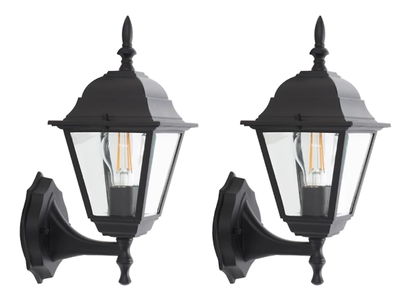 Inspired by vintage gas lamps, these Rhion Black Outdoor Wall Sconces will bring a timeless elegance to your home. It offers a chic way to brighten your front porch or patio! Set includes two (2) wall sconces Each sconce measures 6L x 8W x 14H in. Crafted of metal and glass Black finish Vintage lantern design Accommodates one (1) 60-watt type A bulb; bulb not included Weight: 3.36 lbs. Hardwire installation required Safe for outdoor use Care: Dust with a soft, dry cloth. Use glass cleaner on glass parts. This item is available at Kirklands.com only, not available in stores. Please note: this item cannot be shipped to APO/FPO addresses.