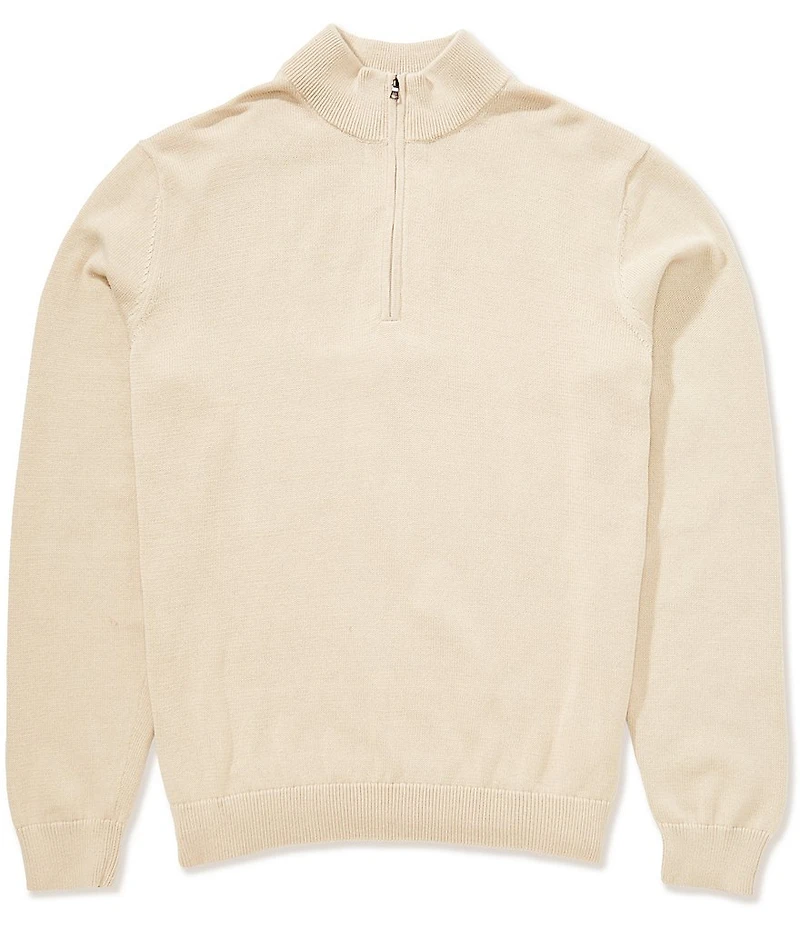 From RHONE, this pullover features: Solid tone Quarter-zip closure Interior chin guard Long sleeves Straight hem Pullover construction Ultrasoft sweater knit fabric Polyester/cotton Machine wash/tumble dry Imported.