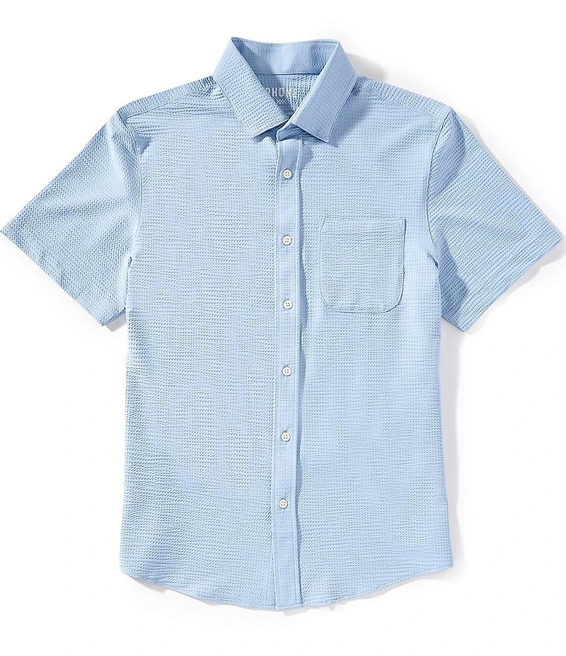 From RHONE, this shirt features: Solid tone Hidden button-down collar Short sleeves Button-front closure Left side chest pocket Stretch seersucker fabric Recycled polyamide/elastane Machine wash/tumble dry Imported.