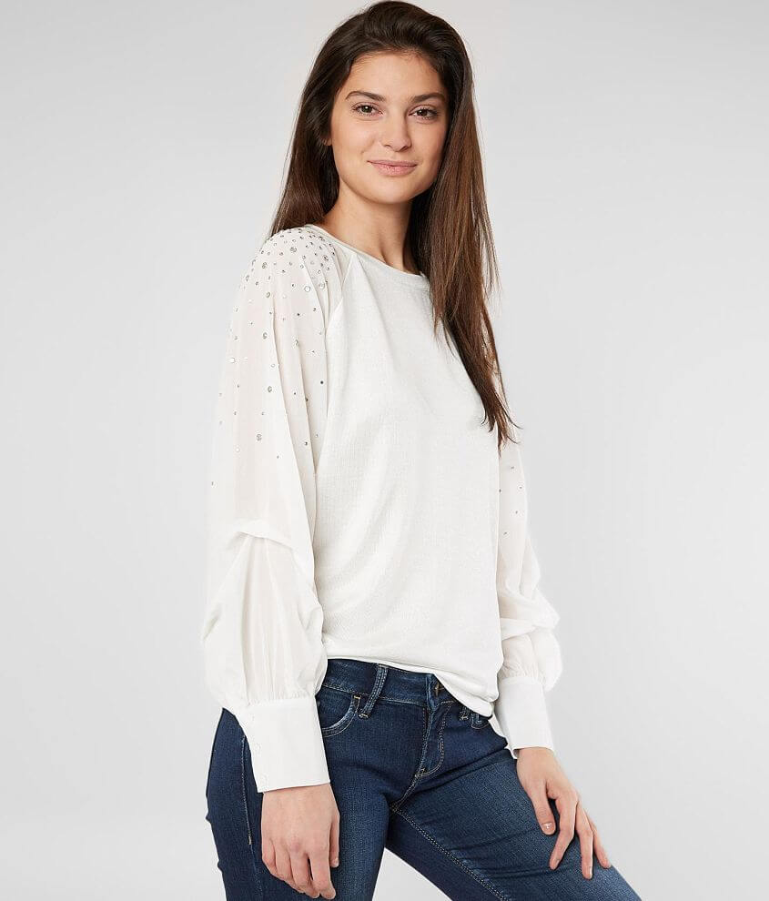 Solid knit top Rhinestone embellished chiffon sleeves Bust measures 36 1/2" on size small Body length 24 1/2" on size small Model Info: Height: 5'9" | Bust: 33" | Waist: 25" | Hip: 38" | Wearing Size: Small