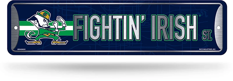 Measuring 4 inches x 15 inches - a size that's ideal for a bedroom, an office or elsewhere you love advertising your love of college sports - this Rico Notre Dame Fighting Irish Street Sign shows off just who you're cheering on. Its durable metal construction ensures it'll remain a welcome addition to your memorabilia collection for a long time to come.