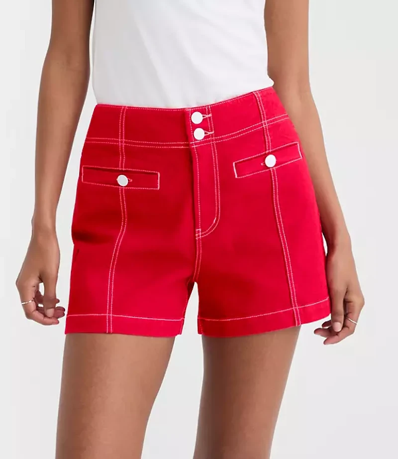 Bullet1: Designed with Comfort Stretch: our mid stretch denim, Pants Details: Front zip with button closure. Belt loops Button welt pockets. Back patch pockets., Leg Shape: Double Shank Short - fitted at the waist, with a slight A - line shape at leg opening, Rise: 12"high rise, sits at natural waist, Imported:, Fit: Our curvy denim shorts are designed to perfectly fit and flatter curves with a roomier hip and thigh - the gap - free waistband of your dreams!, Length: Short, 3 1/2"inseam, Fabrication: 100% Cotton, Garment Care: Machine Washable Loft Rivete Curvy Double Shank High Rise Denim Shorts Size 24 Maple Cherry Women's by Loft Size Regular - 24 Maple Cherry Women's Curvy, Color Shorts Pants 100% Cotton Machine Washable