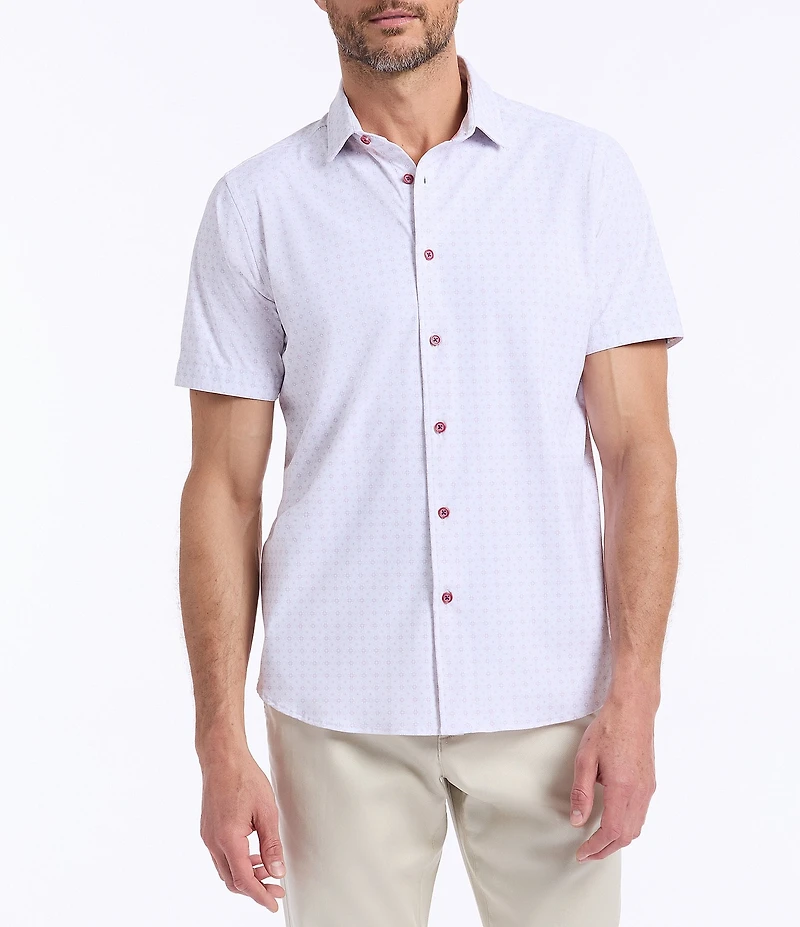 From Robert Graham, this shirt features: Allover mini pattern Point collar Short sleeves Button-front closure Classic fit Stretch fabric Nylon/spandex Machine wash Imported.