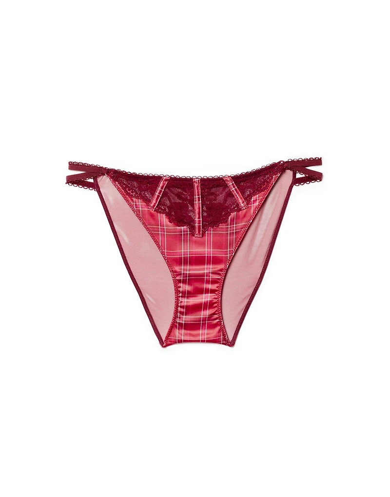 The Rochelle Bikini Plaid Red satin bikini is a romantic-fashion standout. This style features Style: Bikini Panty for a playful twist. (Available in sizes XS-XL.)