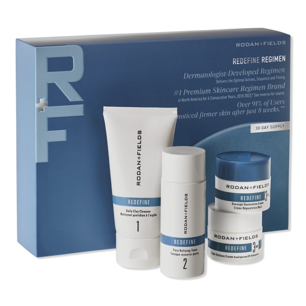 REDEFINE REGIMEN KIT. Benefits: It all starts with science. A targeted, dermatologist-developed regimen to redefine skin with a set of 4 powerhouse products that are designed to work together.. The ingredients applied in the right order at the right time help unlock your healthiest skin.. Use if you want a daily routine that helps visibly lift, sculpt and firm your skin. Recommended for normal to dry skin.. It's popular because it performs. Over 14 million units sold!. Dermatologist developed.. Suitable for all skin types.. Rodan + Fields is the #1 Female Dermatologist-Founded Skin Care Brand in the U.S.*. Includes: Daily Clay Cleanser: The daily cleanser also doubles as a pore-refining mask. This 2-in-1 cleanser with Kanolin Clay gives you the benefit of a facial every day by gently exfoliating, purifying and smoothing skin.. Pore Refining Toner: Prepare your skin to receive the rest of your routine with this skin softening toner. It gently exfoliates, unclogs pores and helps promote natural skin cell turnover.. Triple Defense Cream Broad Spectrum SPF 30 Sunscreen: This medium-weight, peptide-powered daily moisturizer + sunscreen protects from UVA and UVB rays as it improves firmness, fine lines and deep wrinkles.. Overnight Restorative Cream: The nighttime cream visibly plumps and firms your skin as you sleep.. Research Results: Clinically tested.. Based on a 8-week US clinical and consumer study:. 91% noticed firmer skin.. 94% has softer, more supple skin.. 85% has plumper, fuller looking skin.. 79% noticed less visible lines and wrinkles.. *Euromonitor International Ltd; Based on custom research conducted Nov-Dec 2024, Retail Value Sales for 2023, Definitions per Beauty & Personal Care 2024ed..