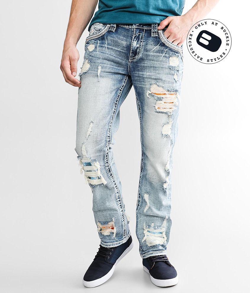 Collector's Edition Regular fit jean Comfort stretch fabric Straight from knee to hem Low rise, 16 1/2" bottom opening Color pop stitch on embroidered faux flap back pockets Hand sanding, whiskering, grinding, destruction with fill yarn, and paisley print backing Zip fly Shoe sku 961248 Model Info: Height: 6'1" | Chest: 41" | Waist: 34" | Hip: 40" | Wearing Size: 32x32