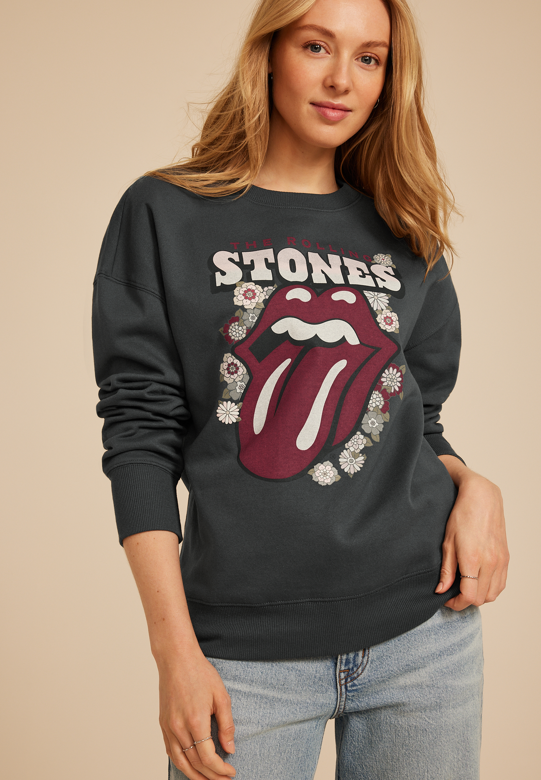 - Licensed "rolling stones" floral graphic