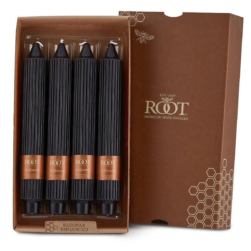 At dinner parties from Manhattan, NYC, to Manhattan Beach, California, our classic Collenette dinner candle is a time-honored favorite. The 9" Collenette has a distinctive, formal profile that lends itself to traditional, formal presentation. A wider diameter virtually assures a flawless performance by eliminating drips. The 1.25" tapered base is compatible with most fine candle holders.Details:Available in multiple colors9" height1.25" tapered base4 candlesUnscentedBeeswax enhanced2.5 hours per inch burn timeRecommended for indoor use only