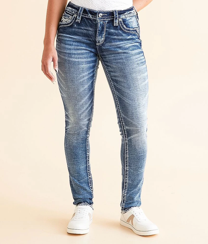 Mid-rise Curvy fit, eased through the hip and thigh 11" bottom opening Rhinestones on metallic embroidered faux flap back pockets Destruction details