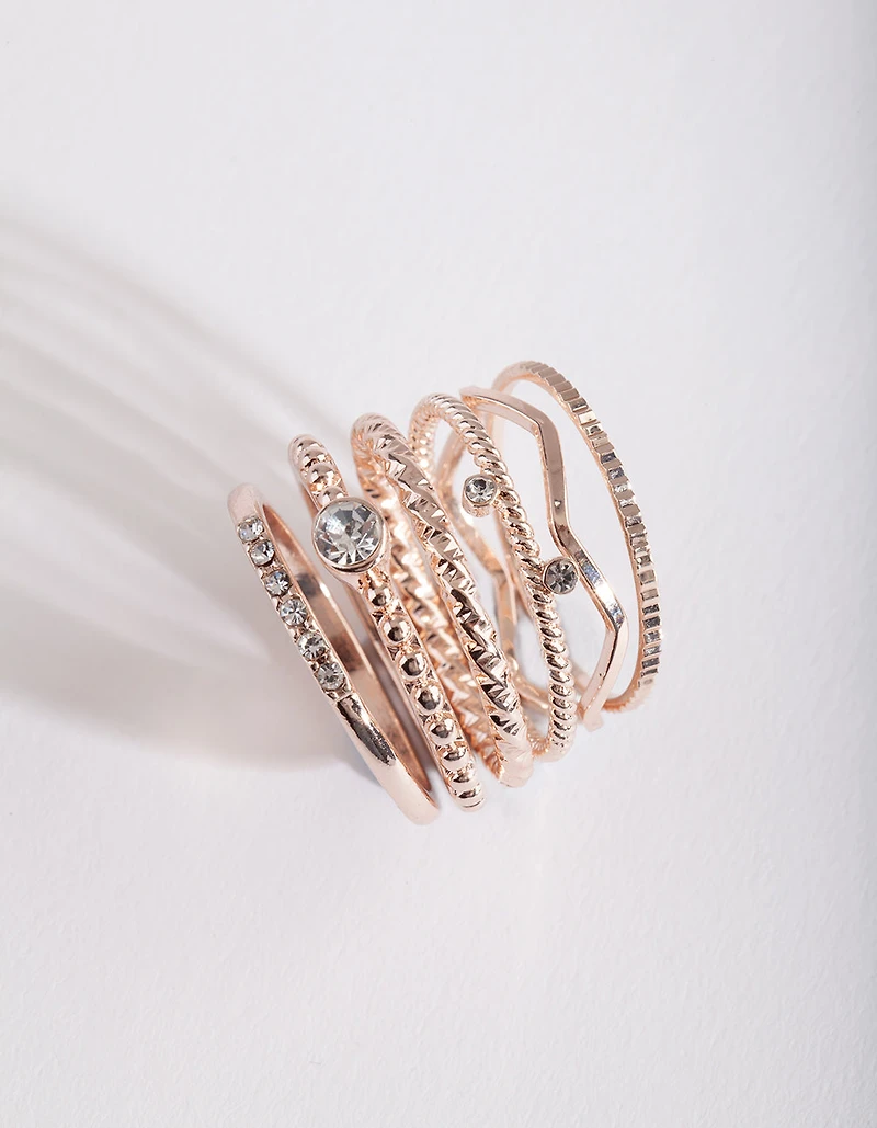 This ring pack includes six rose-gold-toned rings with diamante embellishments. Stack it up! Weight: 7.0g