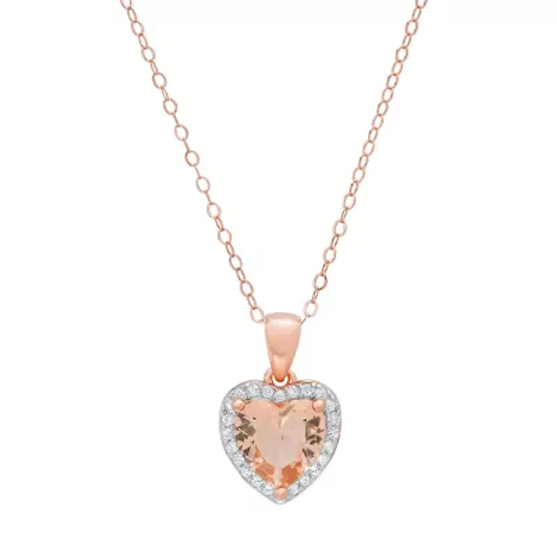 Rose Gold Over Silver Heart-cut Morganite CZ Halo Pendant Spring ring clasp Polished finish Imported Product Specifications 18" Chain ; 16mm L x 10.25mm W 1.81 CTW (diamond equivalent) Material & Care Metal, Sterling silver Clean with a soft cloth.