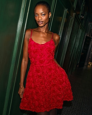 Make a style statement this holiday season in this textured rosette mini dress. This playful style is complete with a flattering v-neckline and fit and flare cut.