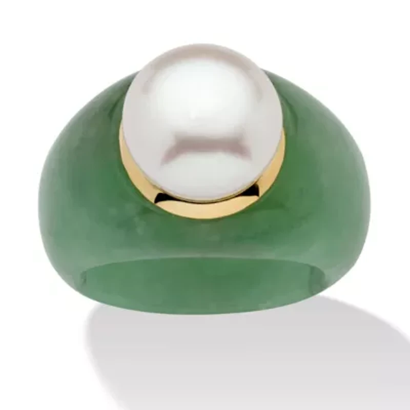 Be seen in green and white. Lavish your finger in this undeniably attractive standout green jade ring. This slick jade ring showcases a luminous 11 mm cultured freshwater pearl. It's the go-to ring that will lend a trend-setting flair to any outfit. 10k gold. Sizes 6-10. As this item contains genuine jade, the actual stone colors may vary slightly. We recommend ordering one size up for this style.Main Stone: 1 Round Freshwater-Cultured Pearl, 11 mm x 11 mmAccent Stone: 1 Genuine Jade10k Yellow Gold; Contains 1.50 grams of 10k GoldMeasures: 12 mm wide x 13 mm long x 13 mm high; Shank Width: 8.5 mm wideIncludes gift box and drawstring pouch10k Yellow GoldContains 1.50 grams of 10k GoldShank Width: 8.5 mm wideDimensions: 12 mm wide x 13 mm long x 13 mm highIncludes gift box and drawstring pouch No clasp, 2 Polished finish Bezel setting Warranty available, Fullreplacement warranty, 30 Days China Imported Material & Care Metal, Gold Clean with a soft cloth.