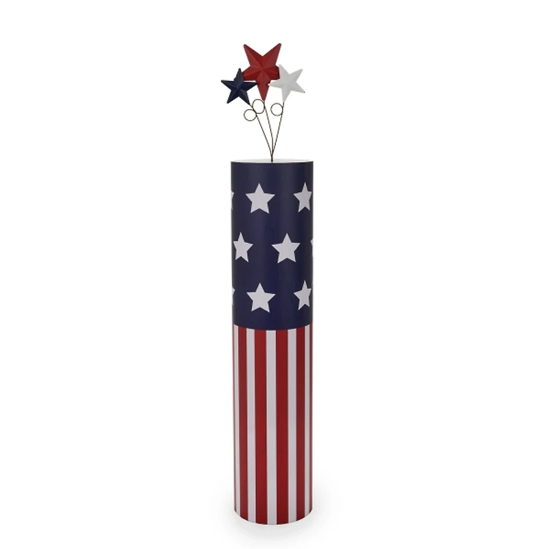This Round Firecracker Outdoor Statue will make your space sparkle with seasonal style. You'll love the star-spangled touch it brings to your porch or patio! Statue measures 30H x 5.25 in. in diameter Crafted of wood composite and metal Firecracker design with star top accents Stars and striped pattern Round shape Hues of red, white, and blue Care: Dust with a soft, dry cloth. Contact your local Kirkland's store for availability. Quantities and selection may vary by location. WARNING: Cancer and Reproductive Harm - For more information go to www.P65Warnings.ca.gov .