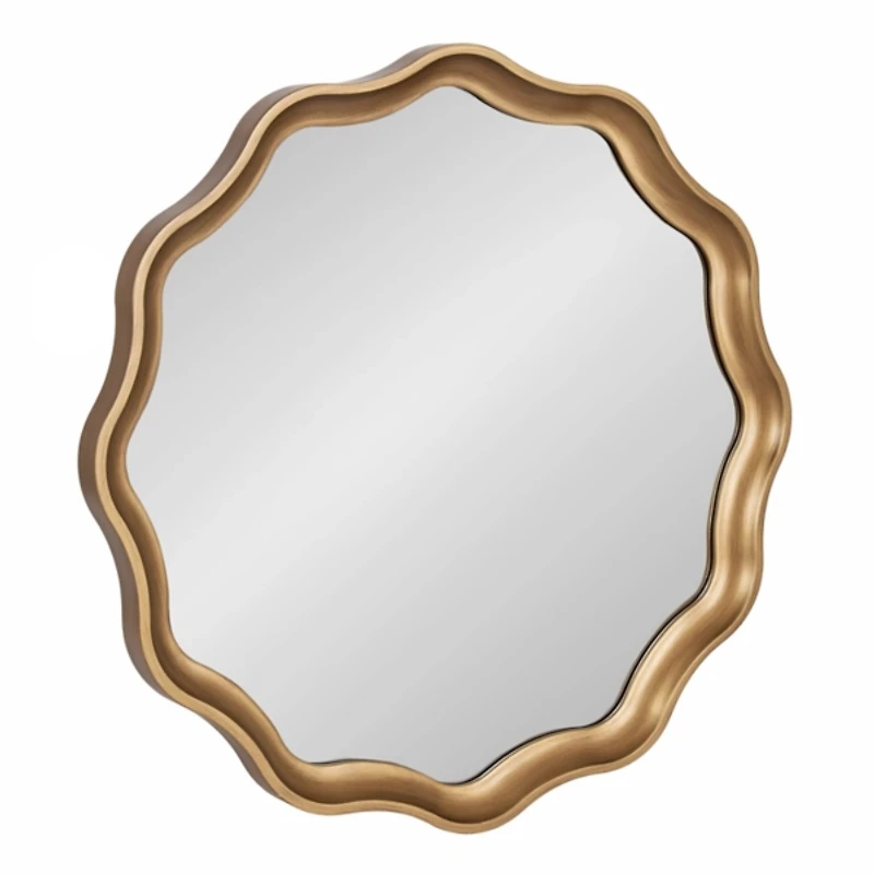 Embrace your inner decorator and elevate your home with our Round Gold Scalloped Wood Wall Mirror. Its chic, dimensional frame will bring vibrancy to any space! Overall dimensions Width: 28 in. Depth: 1.5 in. Height: 28 in. Crafted of wood and mirror Antique gold finish Round shape Scalloped frame Weight: 10.78 lbs. Hangs from back-mounted hardware Care: Dust with a soft, dry cloth. To clean mirror, spray a small amount of glass cleaner onto a lint-free cloth and wipe clean. This item is available at Kirklands.com only, not available in stores. Please note: this item cannot be shipped to APO/FPO addresses. WARNING: Cancer and Reproductive Harm - For more information go to www.P65Warnings.ca.gov .