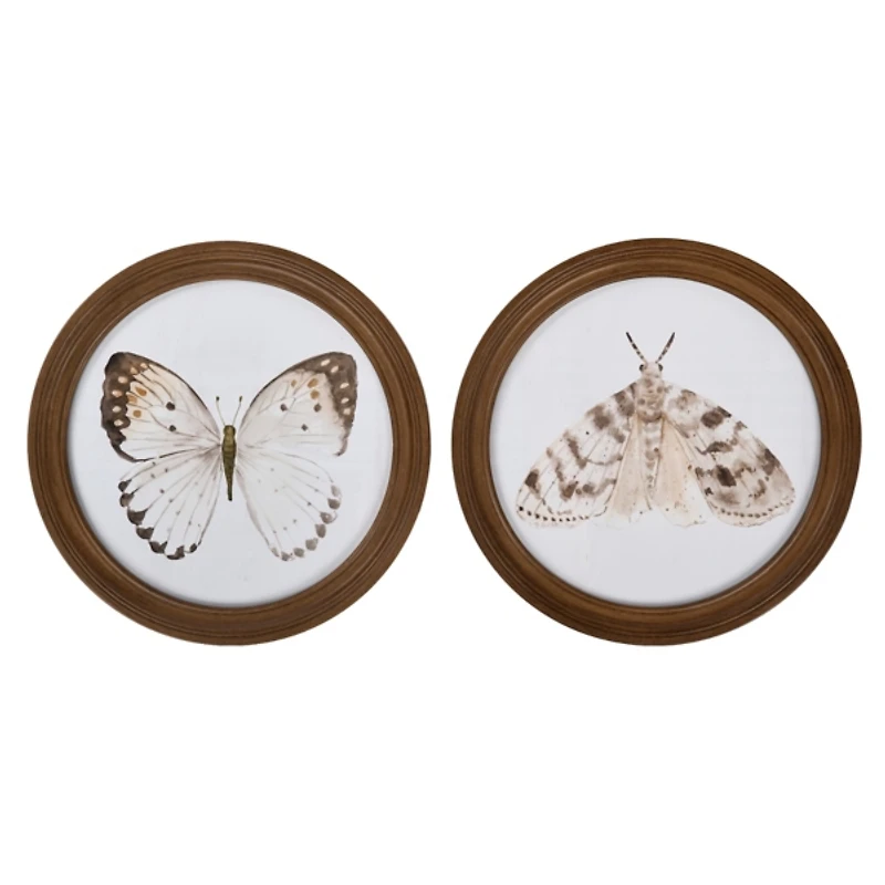 Refresh your wall decor with these Round Neutral Butterfly & Moth Framed Art Prints. With soft, muted tones and beautiful wings, they look wonderful in any space! Sold individually in store Each framed print measures Width: 16 in. Depth: 0.6 in. Height: 16 in. Frame crafted of wood Brown frame finish Round shape Feature butterfly and moth subjects Encased in glass Hues of white, brown, and gray Weight: 4.19 lbs. Hangs from back-mounted hardware Care: Dust with a soft, dry cloth. Contact your local Kirkland's store for availability. Quantities and selection may vary by location.