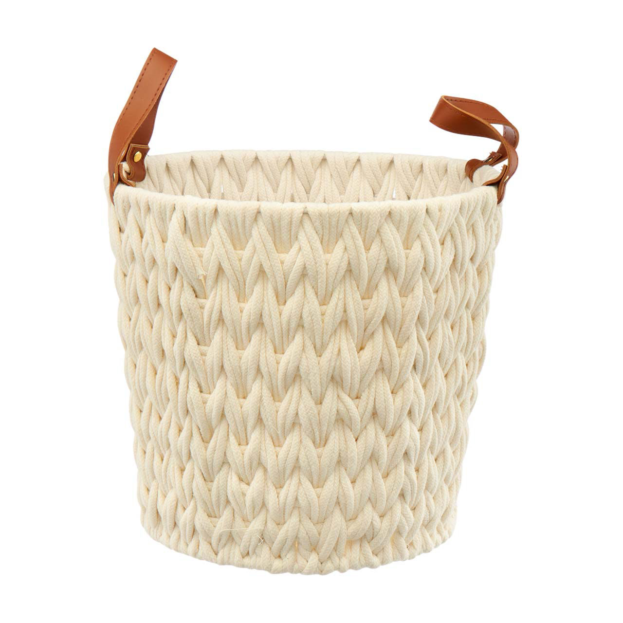 Elevate your home organization with the stylish and versatile Round Woven Natural Fabric Rope Basket with Handles in a lovely cream color. This medium-sized basket is expertly crafted to combine functionality with a touch of rustic elegance, making it a perfect addition to any room in your home. Measuring a convenient size for various storage needs, this basket is ideal for stowing away blankets, toys, magazines, or other household essentials. The woven design features thick, natural fabric ropes that are intricately braided, creating a visually appealing texture that adds warmth and charm to your decor. The cream color of the basket ensures it seamlessly blends with any interior style, from modern minimalist to cozy farmhouse. The neutral tone complements a wide range of palettes, making it a versatile piece for any space. Equipped with sturdy handles made of faux leather, this basket is easy to carry from room to room. The handles are securely attached with brass rivets, adding a hint of sophistication while ensuring durability for everyday use. Whether you're organizing your living room, bedroom, or bathroom, the handles provide convenient portability. Constructed from high-quality materials, this woven basket is designed to last. Its flexible yet robust structure allows it to maintain its shape while accommodating various items. Plus, its open-top design makes access simple and quick, so you can effortlessly find and retrieve stored items. Transform your home with the Round Woven Natural Fabric Rope Basket with Handles, Cream, Medium from pOpshelf. It's not just a storage solution—it's a stylish statement piece that enhances your home's aesthetic while keeping your space tidy.