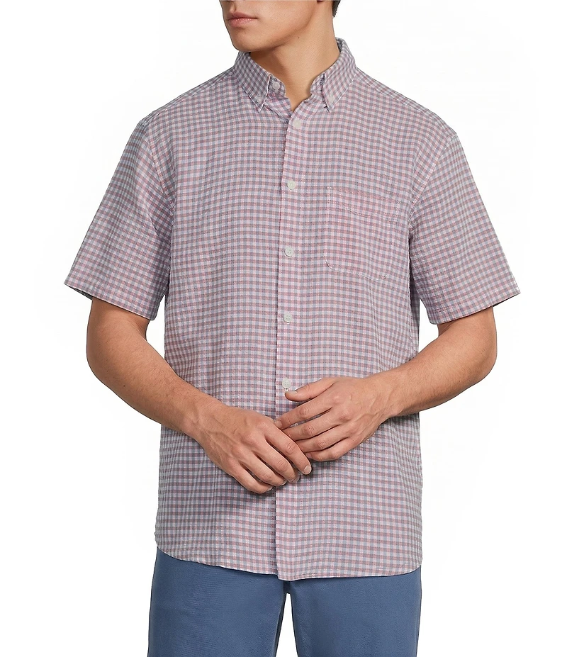 From Roundtree & Yorke, this shirt features: Check pattern Button down collar Short sleeves Button front closure Single patch pocket on the left side of chest Linen/cotton Machine wash warm/tumble dry Imported.