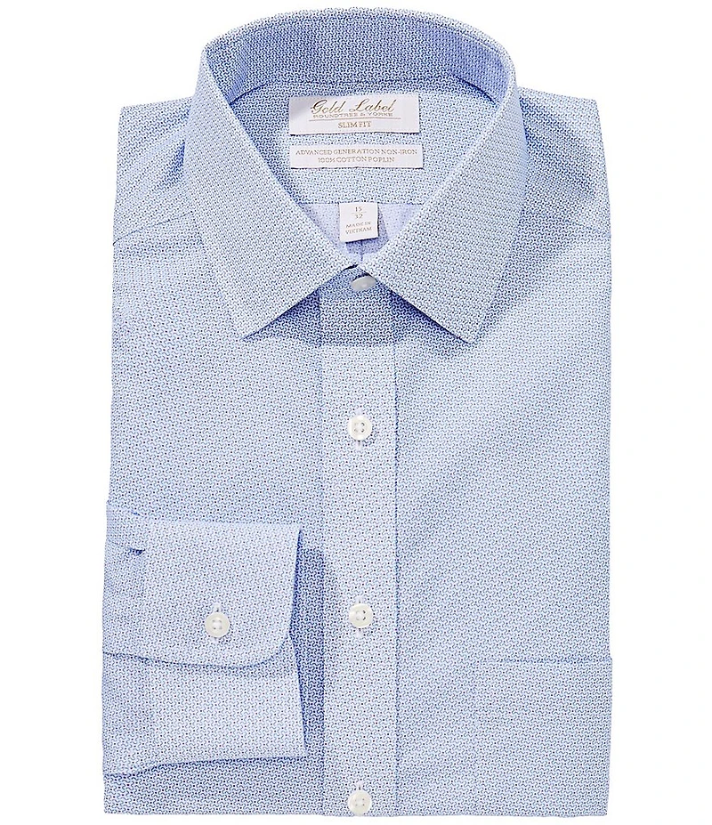 From Gold Label Roundtree & Yorke, this dress shirt features: Poplin fabric Spread collar Long sleeves with button barrel cuffs Button-front closure Single patch pocket Slim fit Advanced generation non-iron technology Yarn-dyed Cotton Machine wash/tumble dry Imported.