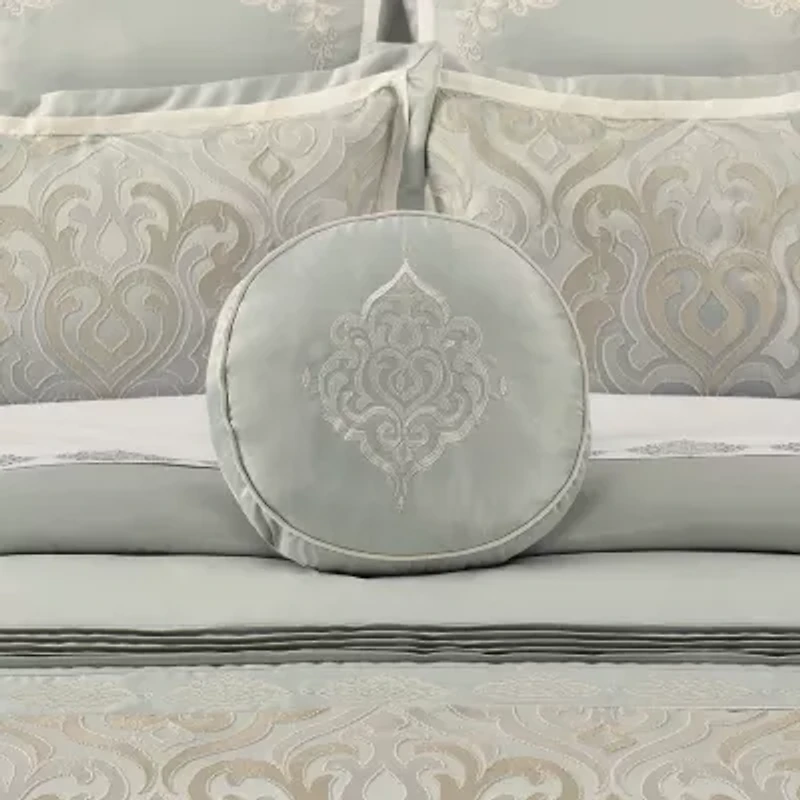 The Calmfield Tufted Round Pillow features a matte satin fabric in a soft aqua color to create a one-of-a-kind accent to this bedding ensemble. These unique pillows are hand-sewn and finished with a fabric-covered button on both sides. Pair this pillow with the Calmfield comforter set for a complete, elegant look.