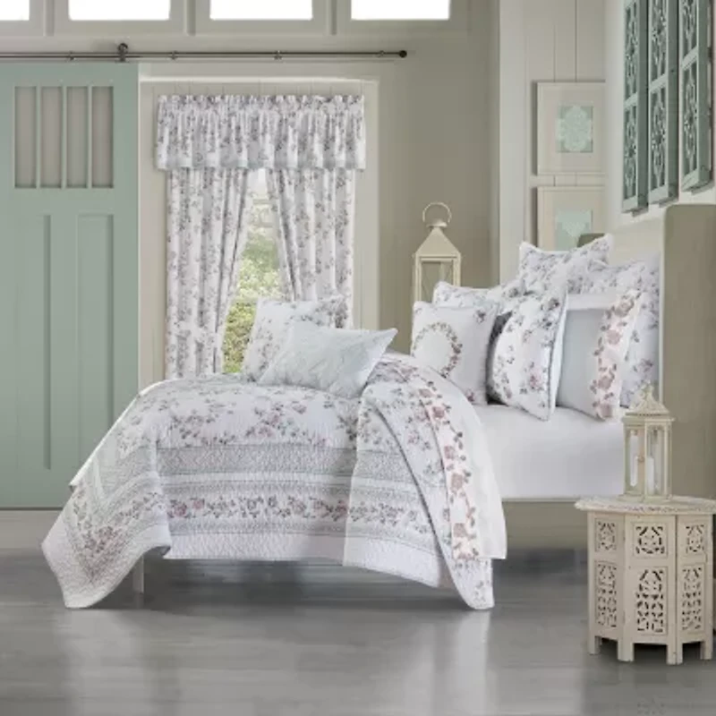 Inspired by artisan porcelain, the rialto sage quilt set features a classic floral design, creating an atmosphere of sophisticated elegance. This framed engineered floral pattern in blush and sage color is simply lovely and the sleek quilt reverses to an all-over floral design for a tasteful touch of detail and versatility. Paired with coordinating pillow shams, this stunning collection is the perfect addition to your home. Add the rialto sage window treatments and throw pillows to complete the designer chic look.