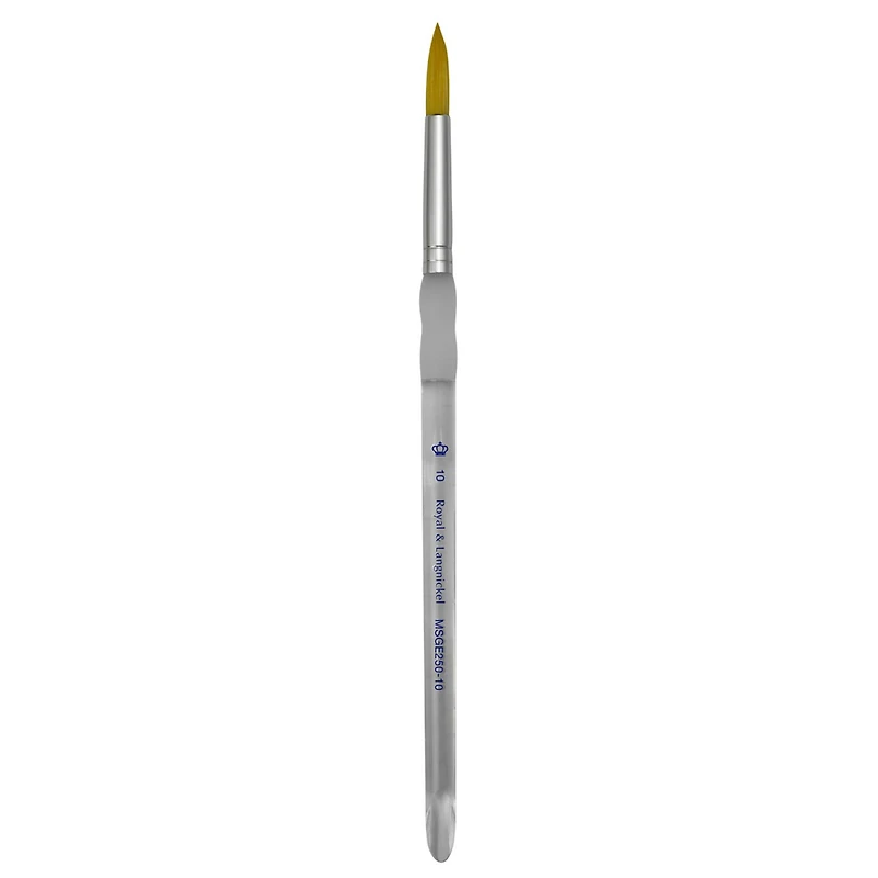 A clear choice for artists, students and hobbyists, this entry-level brush by Royal & Langnickel offers high quality with high value. Its soft rubber grip provides extra comfort while painting, and the sturdy acrylic handle features a beveled-edge end that can be used as a painting knife and sgraffito tool. Like all classic round brushes, the sharp point and round body of this brush gives you the flexibility to paint details, washes, fills and more. Details: Available in multiple sizesGold Taklon filamentShort handleDouble-crimped aluminum ferruleLevel 1For use with acrylic, oil or water-based paints
