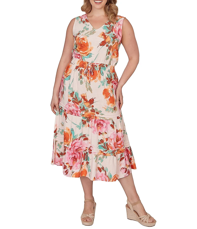 Ruby Rd. Plus Size Bold Floral V-Neck Sleeveless Tiered A-Line Midi Pull-On Dress
