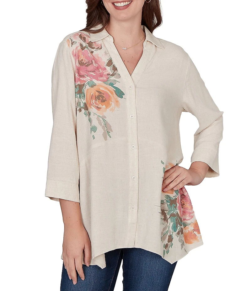 From Ruby Rd. this tunic features:  Sand-washed linen fabrication  Tunic silhouette Collared v-neckline 3/4 sleeves Floral placement print  Shark bite hem  Button-front closure Rayon/linen Machine wash cold Imported.