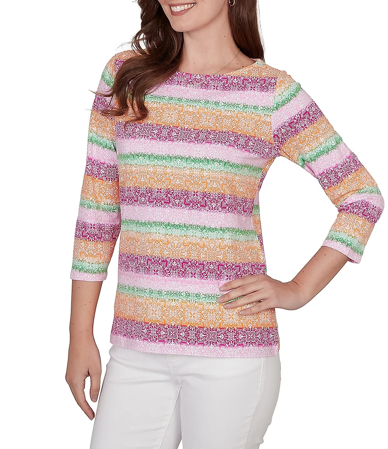 Ruby Rd. Stripe Medallion Boat Neck 3/4 Sleeve Top