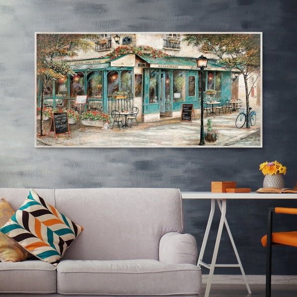 Art inspires, uplifts, and expresses your personal style. Pull your space's look together with this eye-catching Rue Du Jardin Corner Bistro Framed Wall Art. Art measures 55L x 1.5W x 28H in. Printed on stretched, polycotton blend canvas White wooden flush frame Corner bistro subject Hues of blue, black, tan, green, and red Artist: Ruane Manning Hangs from back-mounted hardware; sawtooth hangers included Care: Dust with a soft, dry cloth. Contact your local Kirkland's store for availability. Quantities and selection may vary by location.