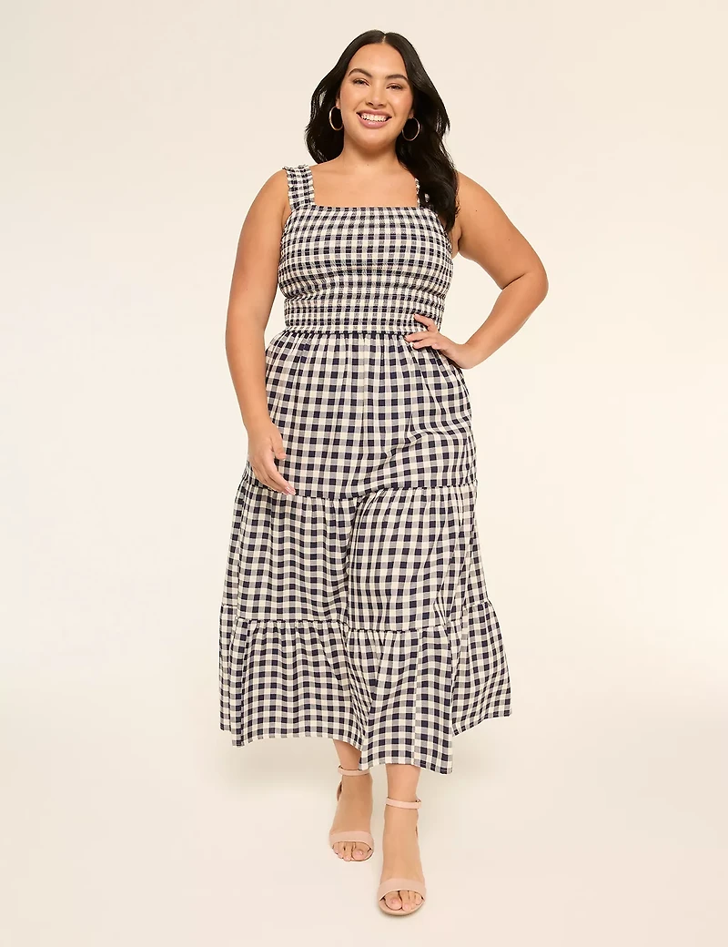 Available in Plus Size An instant classic in your closet. This gingham-printed, ruffle strap dress goes with any jacket or cardi, and will carry you well into the cooler seasons with its timeless style and ease. FIT: Tiered. Classic fit bodice with a relaxed, tiered skirt. Front Length (On Body): 53.5" Midi length FEATURES: Sleeveless with 2" wide ruffle straps Smocked bodice with square neckline Tiered skirt Pockets No closure, pull-over style FABRIC: Twill. Structured cotton that keeps its shape, with the perfect amount of stretch for all-day comfort. Machine Wash Cold With Like Colors; Only Non-Chlorine Bleach When Needed; Tumble Dry Low; Cool Iron If Needed 60% Cotton/40% Rayon Item Number #414899 Imported Plus Size Dress ". Plus Size Ruffle-Strap Square-Neck Tiered Midi Dress, in Navy Gingham, 22/24 Petite, Women's, Lane Bryant
