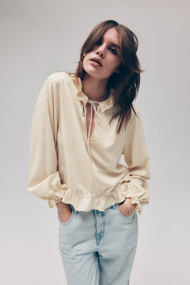 Blouse in woven viscose with eyelet-embroidered details. Ruffle collar, V-shaped opening at front with narrow ties, and long balloon sleeves. Ruffle trim at cuffs and hem.