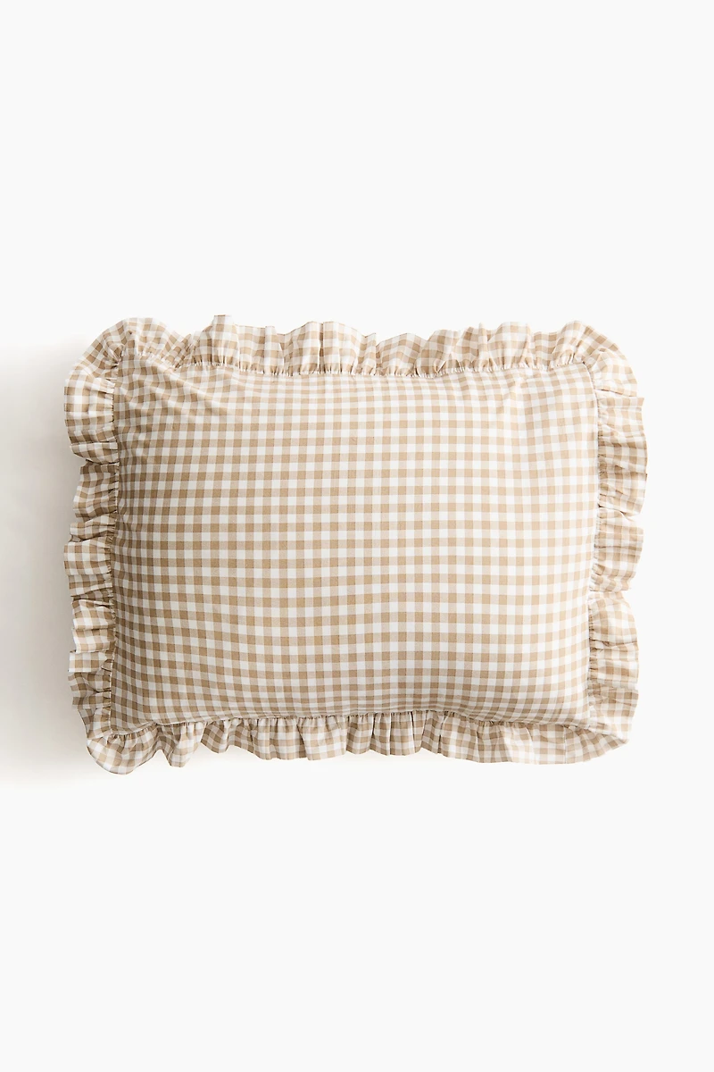 Pillowcase in woven cotton with a printed pattern, ruffle-trimmed edges, and an envelope opening at back.