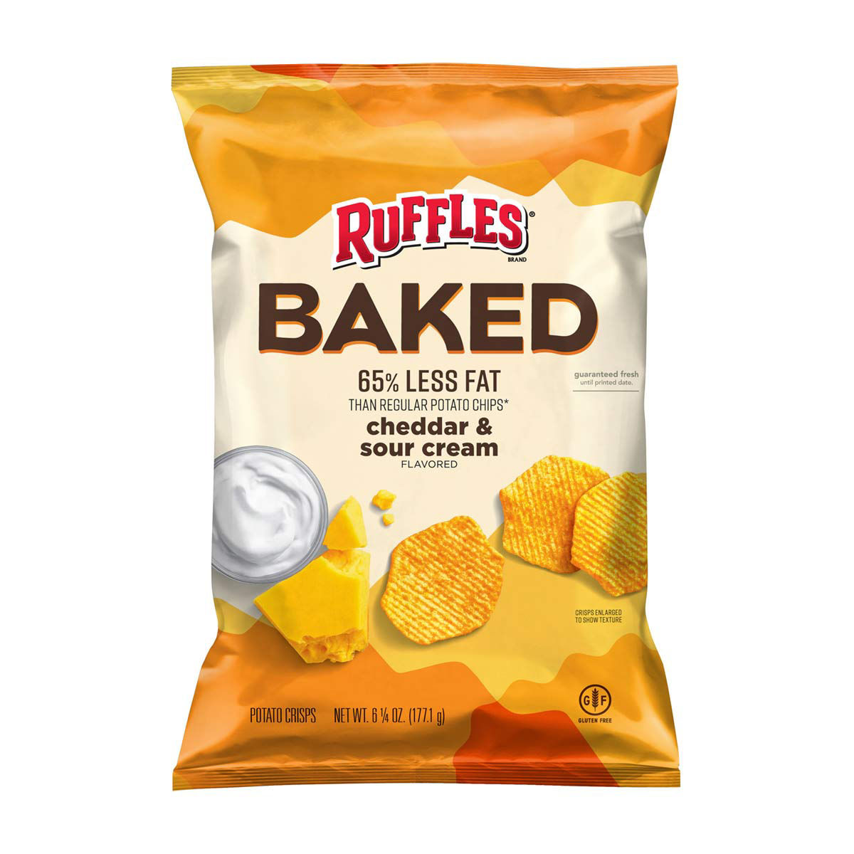 Savor the flavor of these Ruffles Oven Baked Cheddar and Sour Cream Potato Chips. These chips are baked and contain 120 calories per serving. It is naturally and artificially flavored and has zero grams of trans fat. It comes packed in a bag, which makes it easy to carry and store, and has about 6 servings.