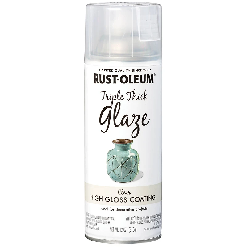 Rust-Oleum triple thick glaze is a crystal-clear, extra-thick aerosol that creates a glossy coating that is both decorative and protective. This topcoat is great for use on wood, metal, wicker, plastic, glass, plaster, ceramic and paper.Details:Clear high gloss12 oz. (340 g)Non-yellowing top coat Goes on thicker than other clear coatingsApply two or more light coats a few minutes apartFully dries in 24 hoursFor use on indoor and outdoor surfaces