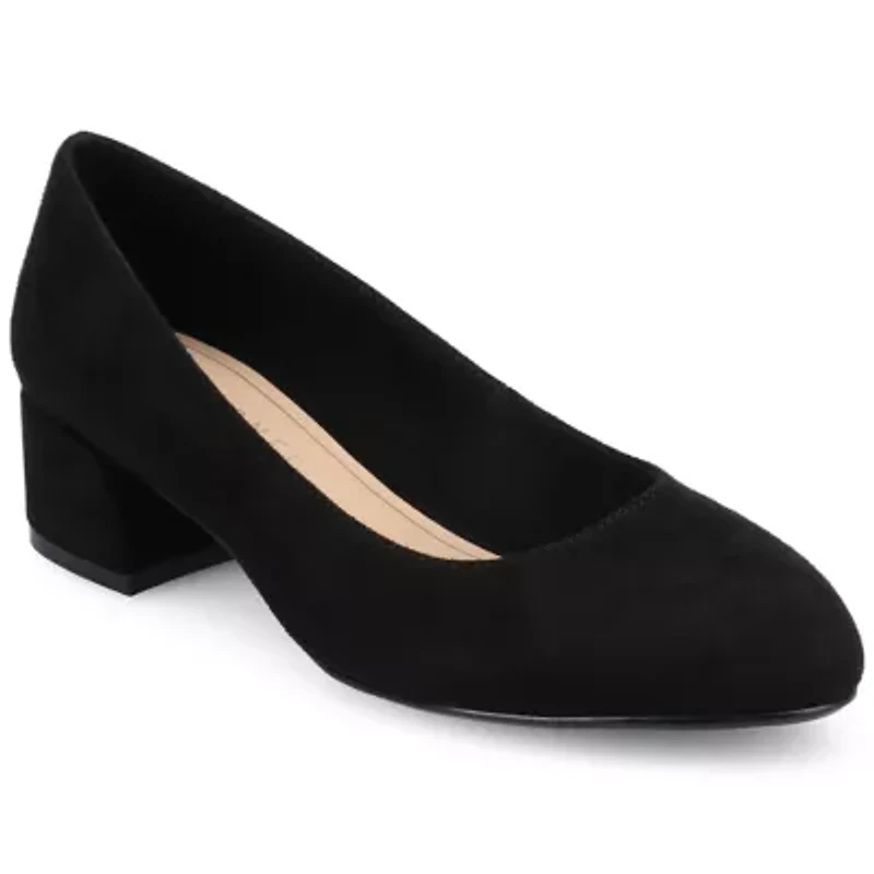 The Saarii heel from Journee is a chic slip-on featuring stylish faux leather. Its modern covered block heel adds both height and stability, while the round-toe and cushioned insole offer a soft, comfortable silhouette. This fashionable women's shoe design effortlessly steps up any look, blending comfort with contemporary flair for all-day wear. Also available in wide width. Slip-on Padded insole China Imported Product Specifications 1.5 in Flat W Material Synthetic polyurethane